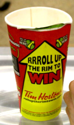 每年的三四月间,Tim Hortons 还会举办一个 Roll Up 喝咖啡活动,凡是这段时间去Tim Hortons 喝咖啡,纸杯全都印成了中奖的图案,当你喝完咖啡后,将杯口最上边向上卷起,就可以看到你是不是中奖了,最小奖是中一杯咖啡,最大奖是中一辆车。曾经有一年,有两位学生在学校操场的垃圾箱里捡到一个空咖啡纸杯,估计是喝咖啡的人忘记查看是否中杯了,结果这两位学生将纸杯口展开一看,竟然中了一辆车,后来这两家就打起了官司,都说是自己先捡到的此咖啡杯……这段新闻还被加拿大的各大报纸热炒了一阵子。