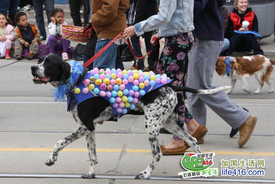 狗狗们也来参加复活节大游行。瞧瞧这只斑点狗,好开心啊。