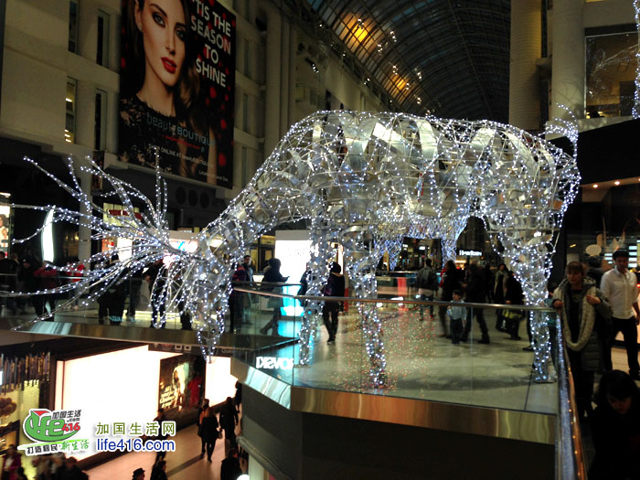 【加国生活网专稿】Toronto Eaton Center 是多伦多最著名的购物中心和旅游景点,每年的圣诞季,这里都会装饰得特别漂亮。2012年的圣诞节,Eaton Center 增加了全新的圣诞彩灯—极具加拿大特色的麋鹿彩灯。