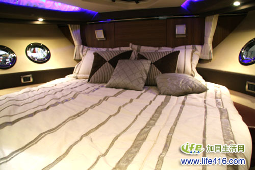 游艇里面有厨房、客厅、两个主人套间(都配备了King Size的大床)两个卫生间,还有桑拿房和洗衣机呢。