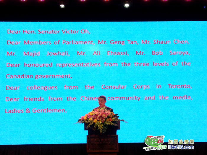 加拿大三级政要代表分别致辞,欢迎韩总履新,并表示当前加中关系正处在新的“黄金时代”,中国是世界第二大经济体,也是加第二大贸易伙伴,加中关系前景广阔。驻多伦多总领馆领区在全加地位重要,华裔人口比例高,在推动加中关系发展中作用突出。加各级政府高度重视对华关系,感谢广大华侨华人为当地经济社会建设和加中关系发展所作贡献,愿与中方共同努力,不断拓展两国及地方各领域务实合作,深化两国人民间友谊。