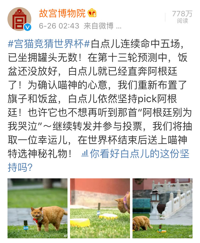故宫御猫竞猜世界杯:已连续命五场,坐拥罐头无数