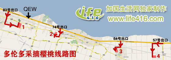 出行路线:从QEW的57号出口转入South Service Road,这条路就在QEW的南边,和QEW呈并行,沿着South Service Road向西开大约2公里左右,见到Cherry Avenue向左拐,再一直向南开,在John Street和Claus Road之间就是Cherry Avenue Farms。