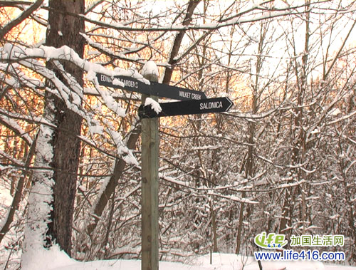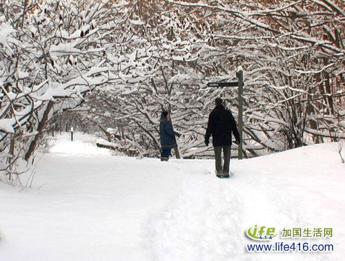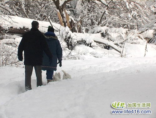 到Edwards Garden赏雪景的人还不少呢,这两位加拿大当地人就住在附近,带着两条狗到这里散步。他们说,他们在多伦多生活了那么久,第一次看到这么漂亮的雪景。