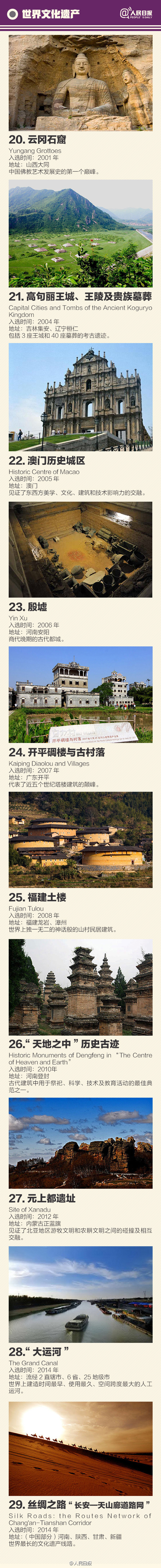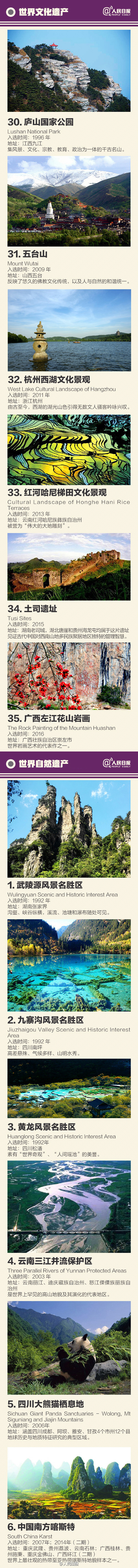 2016年7月17日,我国湖北神农架,成功列入世界自然遗产名录。此前,广西“左江花山岩画文化景观”也申遗成功。至此,我国世界遗产总数已达50项!长城、明清故宫、莫高窟、京剧、中医针灸……中国50项世界遗产+38项非物质文化遗产全名录↓丰富的遗产,是文明印记,.....祖国的世界遗产都有哪些,你知道吗?抽空去看看吧!