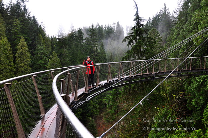 其实在卡佩兰奴吊桥公园里的探险不到绝绫小道绝不算结束。他,我们的导游jack此时就在绝岭小道的中间,脚下离脚下的卡佩兰奴河面几百米的,就靠几根钢索支撑起这条空中走廊。。。