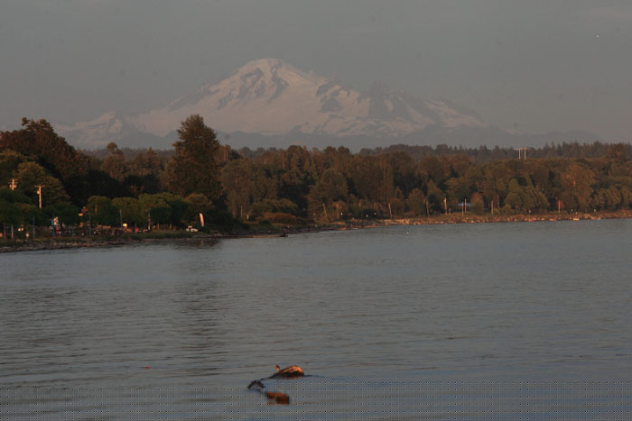 栈桥上风光无限,森林那边远处的雪山身披夕阳,给人以暖洋洋的感觉,近处水边岩石上满是晚归的海鸥,那里是它们的家园。