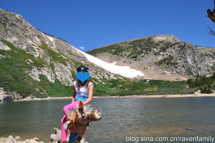 宝贝一家从没见过冰川,今年夏天宝贝爹设计的旅游路线就带我们一家人去看了美国最南面的冰川----St. Mary's Glacier(圣玛丽冰川群)。下面这张照片是俺家宝贝爹用手机的什么功能照的宽屏相片,这是在近山顶的地方的圣玛丽湖和边上的冰川。7月哎,山下还是有20多度的,山上却是积雪不化,在山上宝贝妈咪看到一部分人是背着雪橇和滑板来的,显而易见这里可以滑雪,即便是夏天。宝贝妈咪觉得,应该是山体下面是永冻土,所以山上可以有积雪。山下的湖应该是雪水融化而成,冰凉刺骨,但也清澈见底,非常漂亮。
