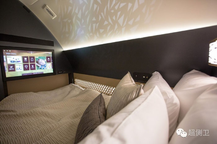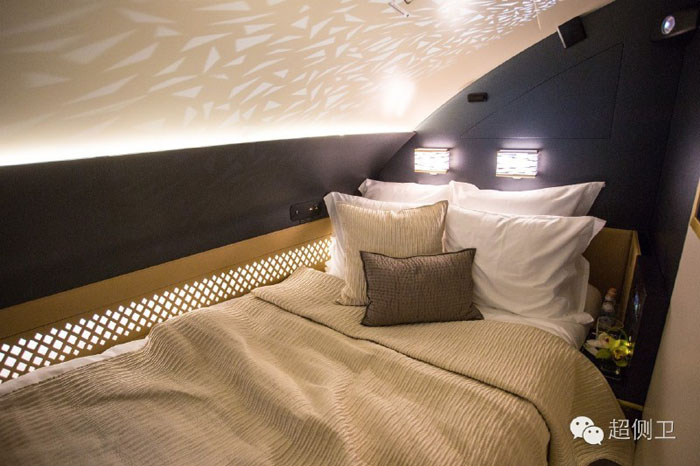 整架A380上仅有一个这样的卧室,卧室里容纳宽度可睡两人、82英寸长(约2米08)的大床,配有饰以精致的意大利面料和天然纤维床垫的双人床,埃及棉床单以及6个软硬度不同枕头。