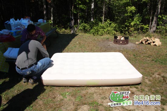 除了帐篷、睡袋外,还有许多人买这种防潮的充气垫,Canadian Tire 打折时卖30多。这种充气垫的好处是防潮,象是睡在床上一样;不方便的地方就是你最好买个电动充气的东西,否则手动充气会把你的手累死;如果是电动充气的话,你就一定要预订带电的Campsite。小编没有买这种充气垫,用的是那种类似橡胶的防潮垫,可以随意卷起来,防潮效果也不错,唯一不好地方就是如果地不平的话,可能会感觉身下面有些硌的慌。