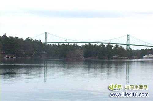为了方便两国的经贸往来,1937年,加美两国共同修建了千岛国际大桥(1000 Islands International Bridge),1938年该大桥正式峻工的时候,还邀请了美国总统前来剪彩。千岛国际大桥全长14公里,美国那边通往美国纽约州州际81号公路,加拿大这边通过高速137号公路连接着安省401高速。大桥宛如一条天然彩虹,为千岛湖增加了几分雄伟。桥的中央就是两国的分界,上面有无人值守的海关。