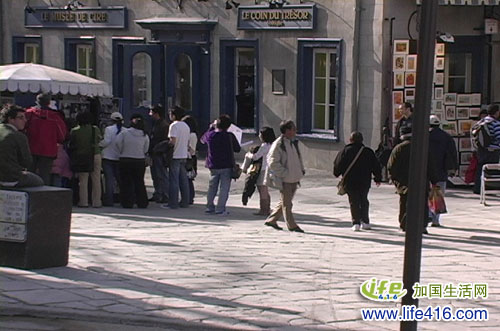 不知在哪里读到过这样一句话:小浪漫需要情调,大浪漫需要勇气。蒙特利尔只能算是小浪漫,大浪漫绝对要数魁北克市的旧城。旧城里处处都是18世纪法国风格的建筑,一个拐弯就是一道风景,再往前走十来米又是一道风景。可惜,我们在魁北克到达旧城的时候已经是下午4点多了,导游只给一个多小时的时间,所以我们只能走马观花地看,我们是看完古堡去下区,看完下区到上区,总想在有限的时间内看到更多的美景。对于美的贪婪,终究会让人痛苦,这话一点也不假,我们不但脚累,眼睛累,心更累,旧城里那么多美丽景色哪是一天两天就能看完的?看来只能寄希望于“毕加索”的画能够卖个高价,好让我能在魁北克买套房子,哪怕是一年只住上一二个月,人生岂不快哉!
