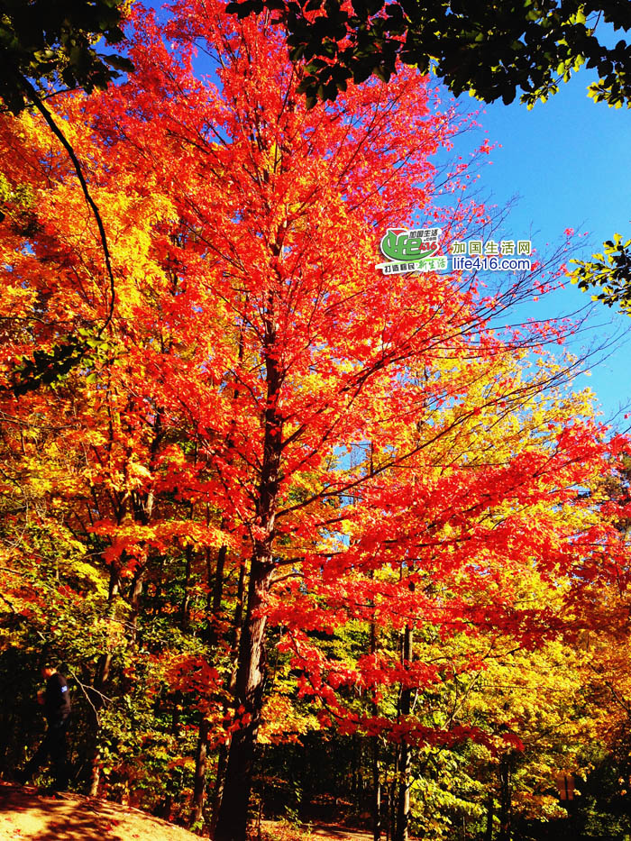 Thomas J Bata Trail入口处有一棵大枫树,枫叶正红得艳丽,360度无方位无死角地漂亮!! 这是从左边远景拍的照片