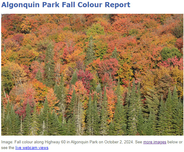 2022年10月7日枫叶情报:Algonquin 省立公园目前是五彩斑斓、层林尽染的颜色,这个感恩节长周末是最佳赏枫时机。