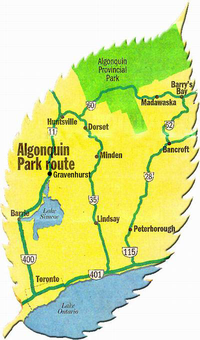小编此次的出行线路是这样的:从多伦多沿Hwy 400北上,在102出口附近换Hwy 11(注意不要在102出口下,要经过102出口,之后会看到Hwy 400上有标志Hwy 11的标志,走左边的那条线就是Hwy 11),再沿着Hwy 11北上(途中会经过白求恩的故乡Gravenhurst小镇),在223号出口(Huntsville小镇)换Hwy 60 向东开,就可以开到Algonquin Provincial Park 阿冈昆公园的西门。