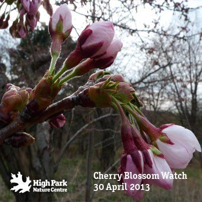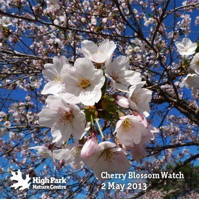 2013年4月15日:据多伦多High Park 公园官方Facebook 所展示的樱花照片显示,由于这几天多伦多的气温回升,现在的樱花骨朵正在茁壮成长。虽然他们也很难预计樱花具体在哪天才能盛开,但根据以往的经验,从这种骨朵状态到开花大致需要二周左右的时间。这还是在这二周气温渐渐升高的情况下做出的估计,如果再下场雪的话,樱花盛开的时间还要再继续推迟的。