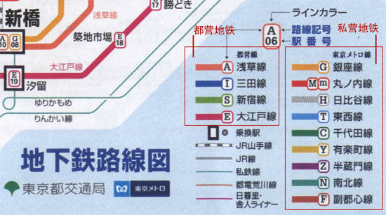 在地铁线路图的右下角,有4条线路与其它9条线路分开标注,这4条线路就是都营地铁线,而另外9条线路则是私营地铁线。