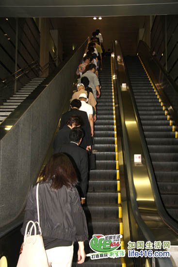 在这里要说点题外话,坐滚动电梯时是有国际惯例的,一定要留出通道让着急的人步行通过。在日本,由于车是左侧行驶的,所以人站在左侧,让出右侧让人通行;而在北美,车是右侧行驶,所以人在站右侧,让出左侧让人通行,我们在多伦多坐滚动电梯的时候就是站在右侧。不要以为这是小事,往往这些小事就能反映出一个民族的素质。
