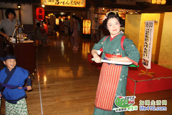 这里不定期地举行一些民俗节目表演。可惜我们听不懂日语,不知道他们为孩子表演的节目是什么内容。看到我的照相机,这位“大婶”很友好地摆起了Pose