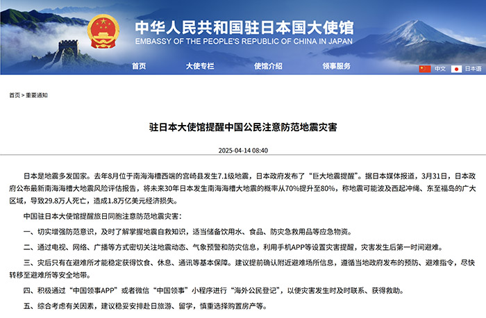 【加国生活网】中国驻日本大使馆于2025年4月14日上午突然发布最新通知《驻日本大使馆提醒中国公民注意防范地震灾害》,提醒旅日同胞防范南海海槽大地震灾害,并慎重选择购置房产。