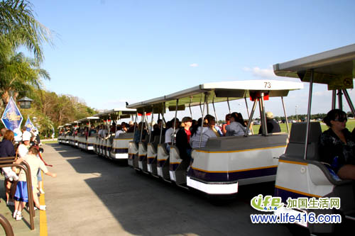 在停车场停好车后,我们就坐公园提供的这种免费车(shuttle bus)到公园的正门。在坐上这个车之前,一定要记住自己的车停在哪个停车场,在哪一行。为什么?Disney每个公园里都有十几个停车场,个个都有足球场那么大,一旦忘记了岂不是麻烦。不过,如果你真的忘记车停在哪里了,也没关系,Disney公园提供为游客寻找车的服务,估计每天总会有几个“二百五”忘记自己把车停哪儿了。