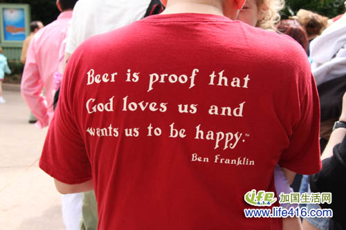 看完音乐剧,正好到了可以取下一个FP的时间,老公去公园16号景点去取“Expedition Everest-Legend of the Forbidden Mountain”(雪山飞车,就在“Finding Nemo”的旁边)的FP,我则坐在路边等他回来,突然看到眼前经过的一位先生的背后写了这样一段话,感到挺有意思,所以抢拍下来给大家看看:说是美国著名的发明家、政治家Benjamin Franklin曾说,啤酒本来就是一个上帝爱大伙并希望大伙快乐的一个最好的证明。我估计喜欢喝啤酒的人肯定喜欢看到这段话……