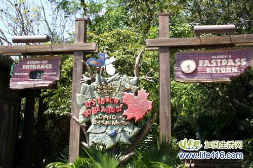 第二个FP所示,16号景点(雪山飞车)得等到下午5点后才能玩上,看来这个景点的项目一定是惊险刺激的那种,要不怎么会那么受欢迎。此外第二个FP上也写明,取下一个FP的时间是下午1点。在取下一个FP之前,我们还有时间去参观别的景点,因此我们决定到位于大树下的景点2——《It's Tough to be a Bug》碰碰运气。到了门口一看,只有20分钟等待时间,此时不进更待何时!