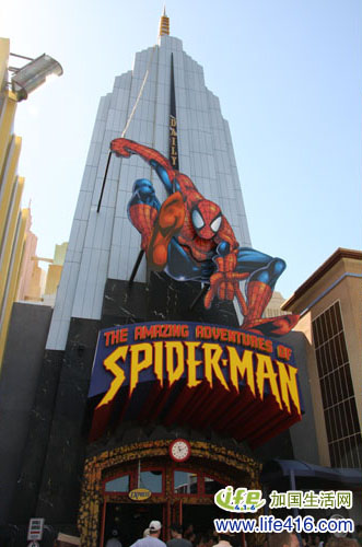 这个“蜘蛛侠刺激探险”的景点可以说是自己体会最深、感觉最好的景点,属于那种三维版的云宵飞车。戴上3D眼镜、坐上轨道车后,刺激的冒险之旅就开始了。轨道车会充分让你体会蜘蛛侠的感觉,一会上天一会入水,还要在各种高楼大厦中飞过,时不时的还有炸弹、火球、飞镖等武器向你飞来(这就是3D眼镜的效果)。为了玩这个项目,排了近一个小时的队,不过在排队进入期间,会进入到不同的屋子里,给你介绍一些有关蜘蛛侠的道具和场景,算是弥补一下无聊排队所带来的“失落感”。看到持“Express Plus”的人们鱼贯而入,有点眼热。因为此项目要上下翻飞,不可能拍到照片,建议大家亲自前往体会,呵呵。