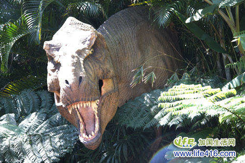 游客是需要坐在船上的。小船沿着一条水道行进,耳边的喇叭里介绍着各种恐龙,每到一个恐龙前,恐龙就会或喷水或吼叫或者运动,开始的恐龙都是食草的,之后就是食肉恐龙,就象这只。