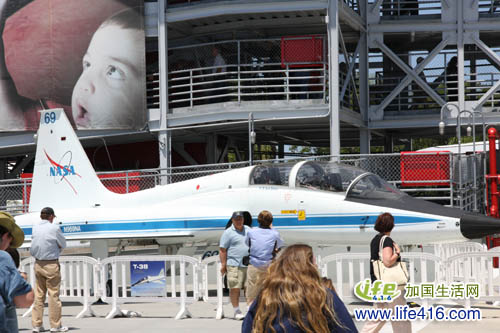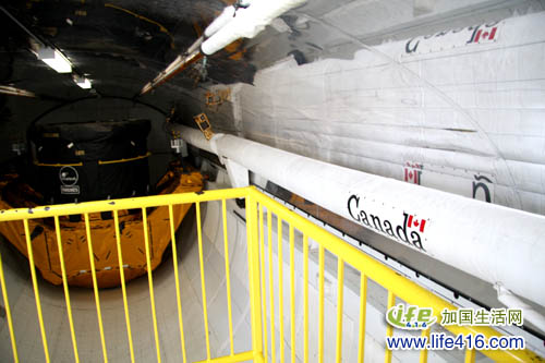 航天中心在飞行器旁建了一个三层楼高的建筑,让参观者排着队依次参观飞行器内部。突然发现这飞行器里有一部分是加拿大参与制造的,还标有加拿大国旗呢。