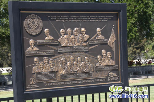 在飞行器的后面,有一片纪念碑,其中的一块特别引人注目。碑中纪念的是为了美国的航天事业而牺牲的宇航员们,这包括1986年1月28日因“挑战者”号爆炸而牺牲的七位宇航员,以及2003年2月1日因哥伦比亚号航天飞机在重返大气层时爆炸解体而牺牲的七位宇航员。
