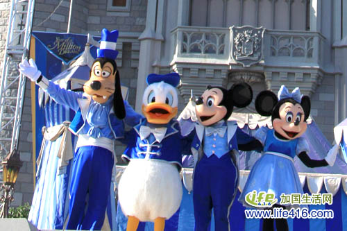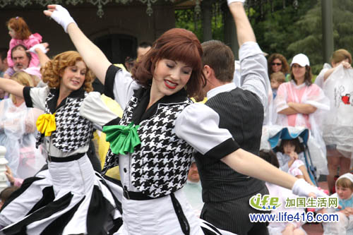 从“鬼屋”里出来,Magic Kingdom 下午游行“Disney Dreams Come True Parade”开始了,在欢快的音乐声中,公园里各个景点的人物和角色全部出席。游行的一开始,先是载歌载舞的人群。