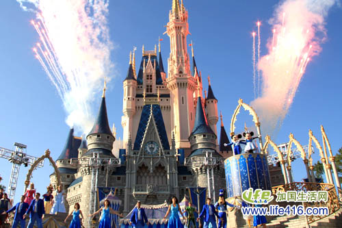 Magic Kingdom 正中央是的迪斯尼象征——那座充满着神话色彩的城堡,在这座城堡前,一年四季都上演着音乐剧“Dream Along With Mickey”。一场大雨过后,城堡上空的蓝天格外地蓝,城堡前的舞台上,米老鼠与唐老鸭、王子与公主们正卖力地在舞台上又唱又跳,他们用歌声和舞姿告诉舞台下的孩子和大人们:“每一个人都应该拥有梦想,每一个人都不要放弃梦想。一旦你拥有梦想,这里正是你梦想成真的地方”。