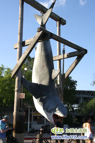 没能到鲨鱼岛坐一次船可谓此次Universal Studios之行的遗憾。Universal Studios主题公园关门时间特别早,是晚上6点,当我们跑到鲨鱼岛门口的时候,只看到这条大鲨鱼吊在那里。据网上的网友介绍,主要的内容是围绕鲨鱼岛坐一次环岛航行,船在行进过程中,时不时会从水中冲出巨大鲨鱼,张开大嘴,冲我们游过来,胆小的船员开始叫了。其实,鲨鱼当然是假的,凡是玩过冒险岛的人,应该是百毒不侵了,挥挥手,跟鲨鱼说声Hi!