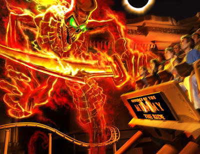 由史瓦辛格主演的电影《终结者》大家都很熟悉,不过在这里上演的三维版的《终结者2》是很难在一般电影院里看到的,不仅仅是需要戴上三维眼镜看电影,而且还有真人演员在现场演出,一会出现在电影里,一会又出现在舞台上,配合得天衣无缝。再加上光电雾火的配合以及围绕在四周的那一群终结者机器人(就象《终结者》电影一开始的情节那样,举着消灭人类的武器对着全场观众),让你切实感受电影中所描述的恐怖。其中有一段相当精彩,《终结者2》中的可以任意变形的机器人在这里变成了保护SKYNET的八爪怪物,那些爪子时不时地就会伸到你的眼前,场上顿时爆发出阵阵尖叫声。