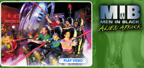 由Will Smith主演的电影《Man In Balck II》(黑超特警组)也在Universal Studios里“安了家”。这个景点的入口房间布置得和电影里黑超特警组总部一模一样,让人仿佛进入了奇妙的世界。这个景点的玩的项目适合童趣未泯的人,三个人坐在一个坐轨道车里,用激光枪打两边各种运动和静止的靶子,最后轨道车上有积分显示。由于我们只有二个人,所以安排我们坐在一个轨道车里,我就有了二只枪,好象“双枪老太婆”一样的,只是枪法不怎么样,好人坏人一起打,嘿,嘿。
