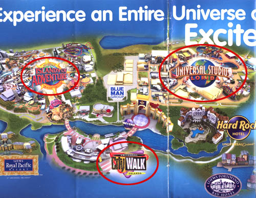 大家从下面的地图所示就可以清楚地看到,而在奥兰多环球影城入口处,还有一处叫做“City Walk”的地方。
