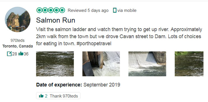 2019年9月20日最新鱼讯:根据Trip Advisor网友们提供的最新信息,Port Hope的三文鱼已经开始集结,三文鱼回游的季节正式开始了!快看下文,了解到Port Hope小镇看三文鱼攻略!!