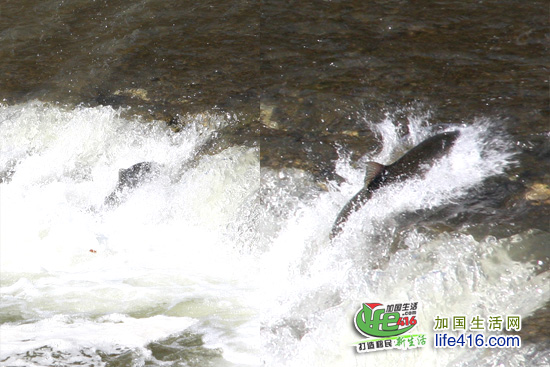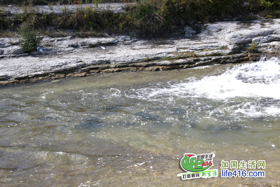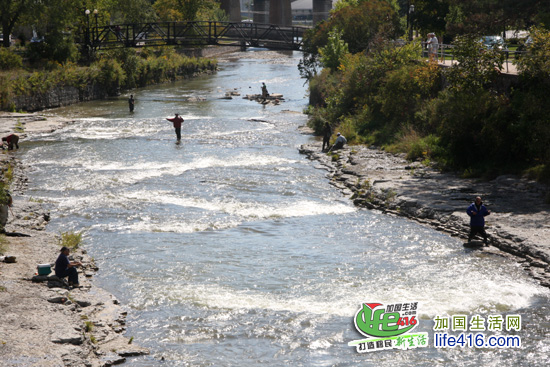 仔细看河里的东东,那黑压压一片的,就是正在逆游的三文鱼(安省的三文鱼都是黑色的,没有BC省的红色三文鱼好看)。