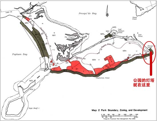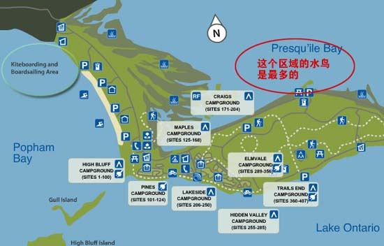 看下面这个地图,Presqu'ile 省立公园的形状就象个靴子一样,它的奇特形状使得它成为众多候鸟迁移的落脚点和聚集地。