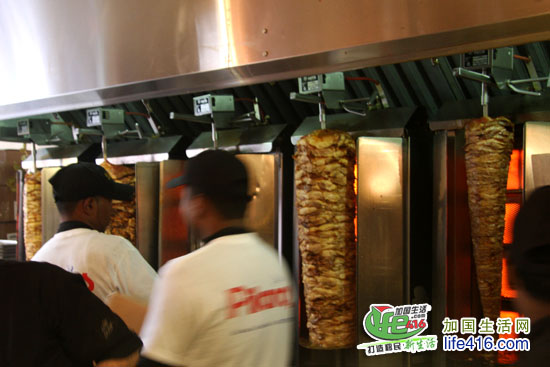 小编在Messini Authentic Gyros 餐馆里顺便拍了几张他们制作Gyros 的照片,这个串串的肉正在火炉前烤着,有各种肉:猪肉、鸡肉、牛肉。