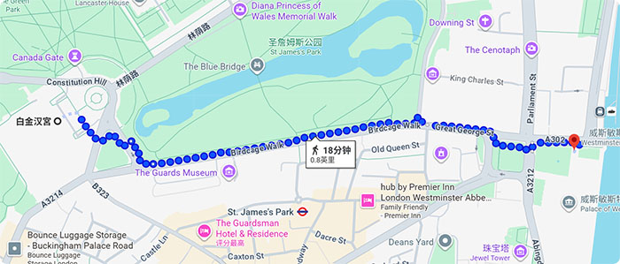 下一站从白金汉宫走到大笨钟(Big Ben)又需要18分钟