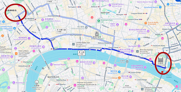 从大英博物馆走到伦敦塔桥大约需要1个小时,本来打算坐地铁去的,后来一想,在伦敦就停留一天,与其坐地铁呆在地底下啥也看不到,倒不如在地面上多走走,能看到伦敦更多的风景。比如,沿着泰晤士河(River Thames)河边走走,就是个不错的选择。