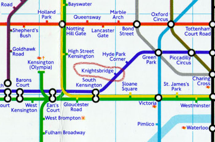 坐伦敦地铁underground Piccadilly Line,如果想去海德公园(Hyde Park),就一定要在Knightsbridge这一站下车