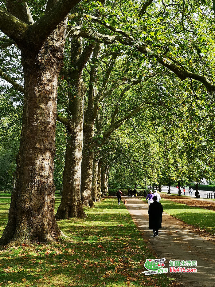 海德公园到处都有参天的粗壮大树,树龄应该都有四五百年。在大树旁的座椅坐了一会儿,晒着阳光,感受着微风,聆听着鸟叫,看着路人匆匆地在一旁走过,感觉每棵大树都见证了许多历史……