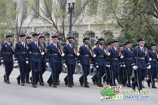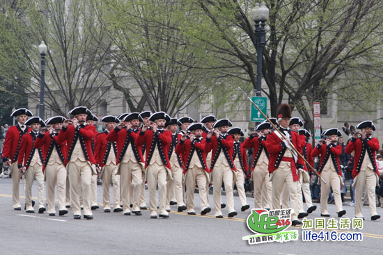 接着走来的是美国海陆空三军仪仗队和军乐队,随着仪仗队一个一个走过,道路两边响起了热烈的掌声,一些华盛顿人高喊“Thank you”,以感谢这些军人的保家卫国。这应该是美国南北战争时期的军装吧?