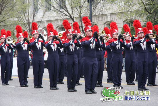 前面不知什么原因停了下来,后面的乐队不得不停下来,在原地演奏。