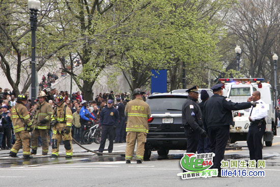 火终于被熄灭了。本来是大家赶来看游行的,结果看了一场“消防课”。华盛顿人还不错,以掌声欢送消防员们离开现场。这一来一回的,半个小时过去了。