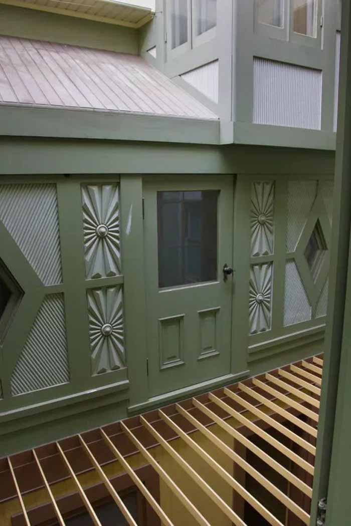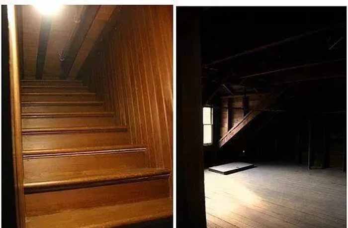 于是她的余生38年里,就在这样的修建中,度过了。电影里几乎重现了莎拉鬼屋的内部构造以及精巧设计。看看这个倒置的屋顶,以及一开门,就会走下一楼的房门。