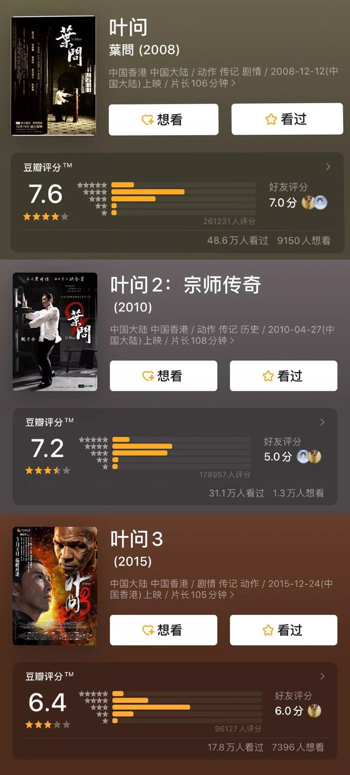 作为功夫系列电影的《叶问》,前两部评分都在7分以上,在第三部的时候,口碑稍有下滑,仍保持了6分半左右,续集里算是很不错的成绩。